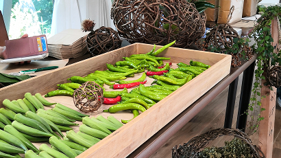 そらりおファームの自家栽培野菜や、地元猪名川町産の旬野菜を中心に使用した日替わりランチのほか、季節に応じた料理を提供します。